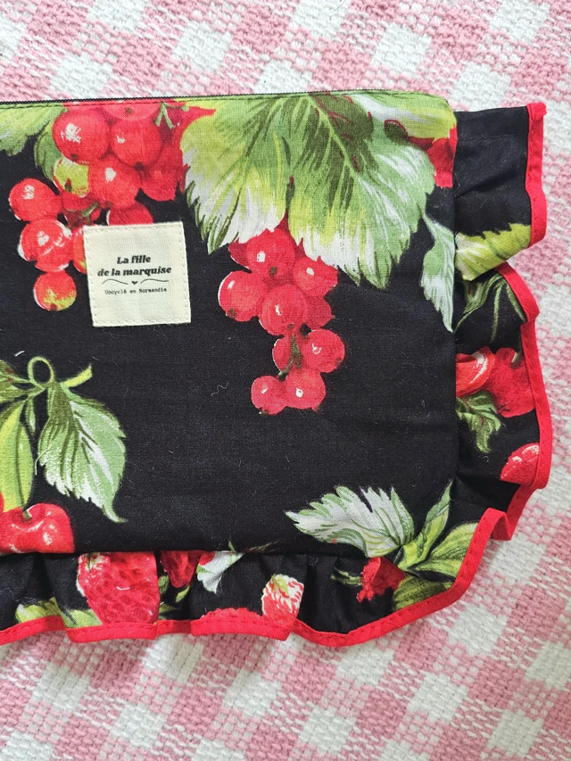 Pour mettre dans son sac ou dans sa salle de bain, pour offrir ou pour s'offrir, la pochette trouvera toujours sa place La pochette à volant "la fille de la marquise" est réalisée en tissus upcyclés dans mon atelier en Normandie. Cette pochette est réalisée à partir d'une serviette de table et la fermeture éclair est également de seconde main Dimension de la pochette (sans volant) : env 20,5*14,5 cm